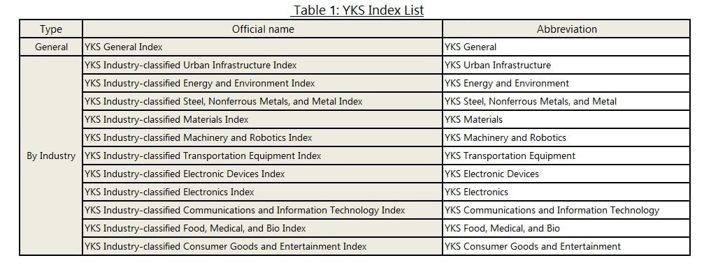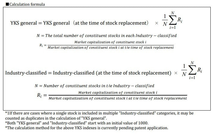 The YKS Index consists of a comprehensive index and industry-specific indexes. The industry-specific indexes select technology high-growth stocks for each YKS major category (excluding "Finance") and calculate their values. The comprehensive index calculates its value from all constituent stocks of each industry-specific index.